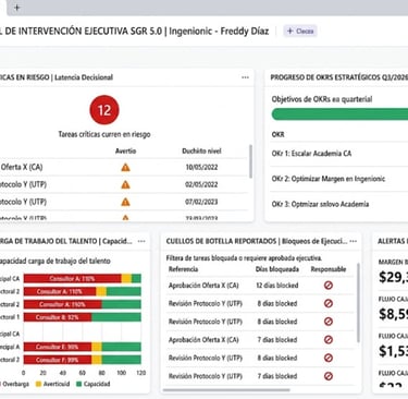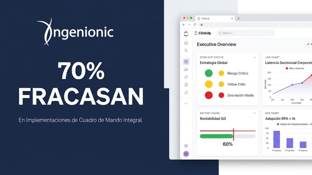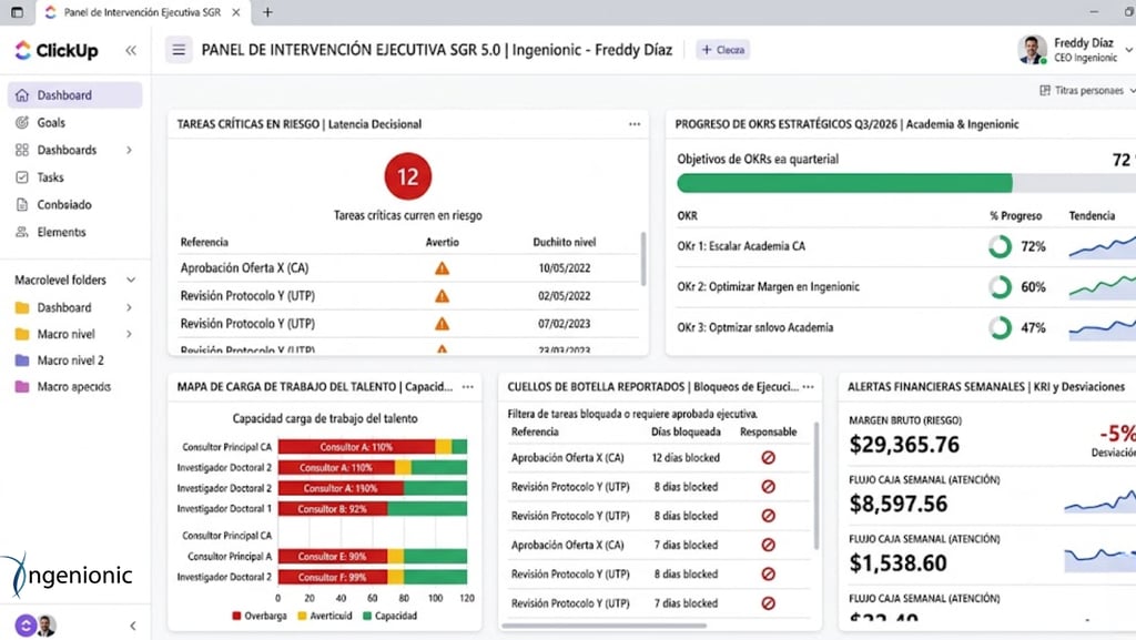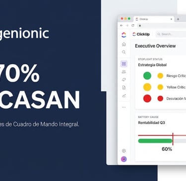 El 70% de las implementaciones del CMI fracasan. Descubre cómo reducir la latencia decisional configurando un panel de intervención ejecutiva en ClickUp.